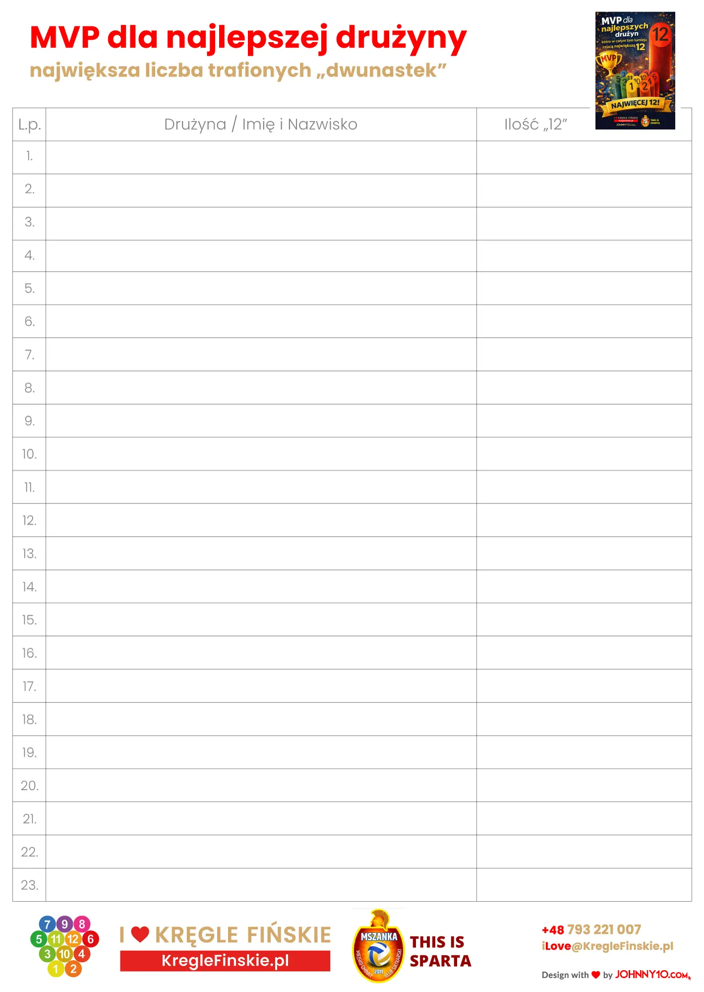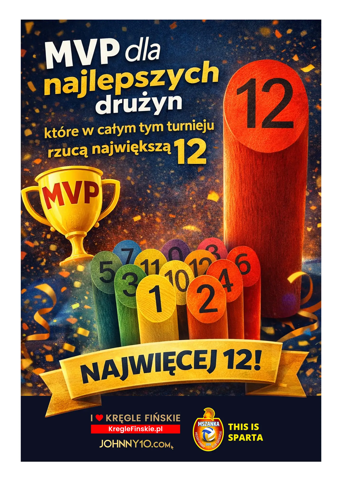 * W związku z rywalizacją nie Fair Play w turnieju z okazji Narodowego Dnia Pamięci Żołnierzy Wyklętych, dnia 1.03.2026 roku jednej z drużyn wprowadzamy zasadę, że po pierwszym spadku do 25 punktów kolejne 12-stki przy następnych spadkach są będą zaliczone. Chcemy nagradzać drużyny które w duchu sportowej rywalizacji są promowane za wysokie rzuty a nie walkę o trofeum za wszelką cenę.